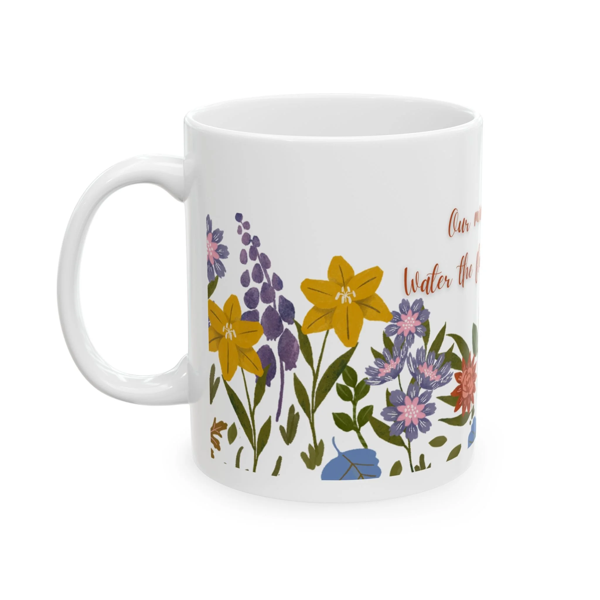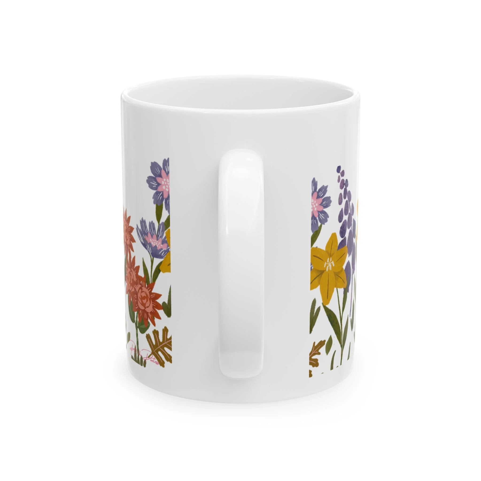 A bright, glossy ceramic mug that brings a little garden to your morning ritual. Delicate hand-drawn wildflowers wrap around the cup in soft, natural tones while an uplifting script peeks above the blooms. The feel is calm and intentional — hold it while you pause, journal, or sip slow coffee on the porch. Durable white ceramic keeps the artwork vivid, and the comfortable C-handle makes it easy to cradle during quiet moments. This mug fits into a slow-living routine and complements cozy mornings, thoughtful breaks, or mindful afternoons with friends.
