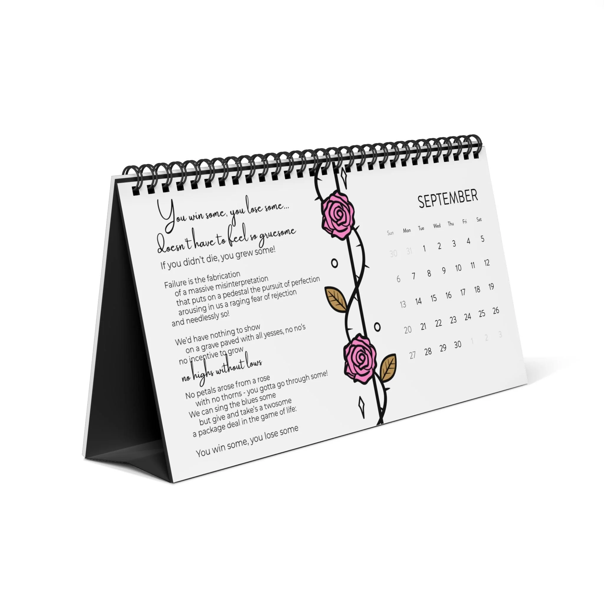 .: Black spiral binding and tent card backing