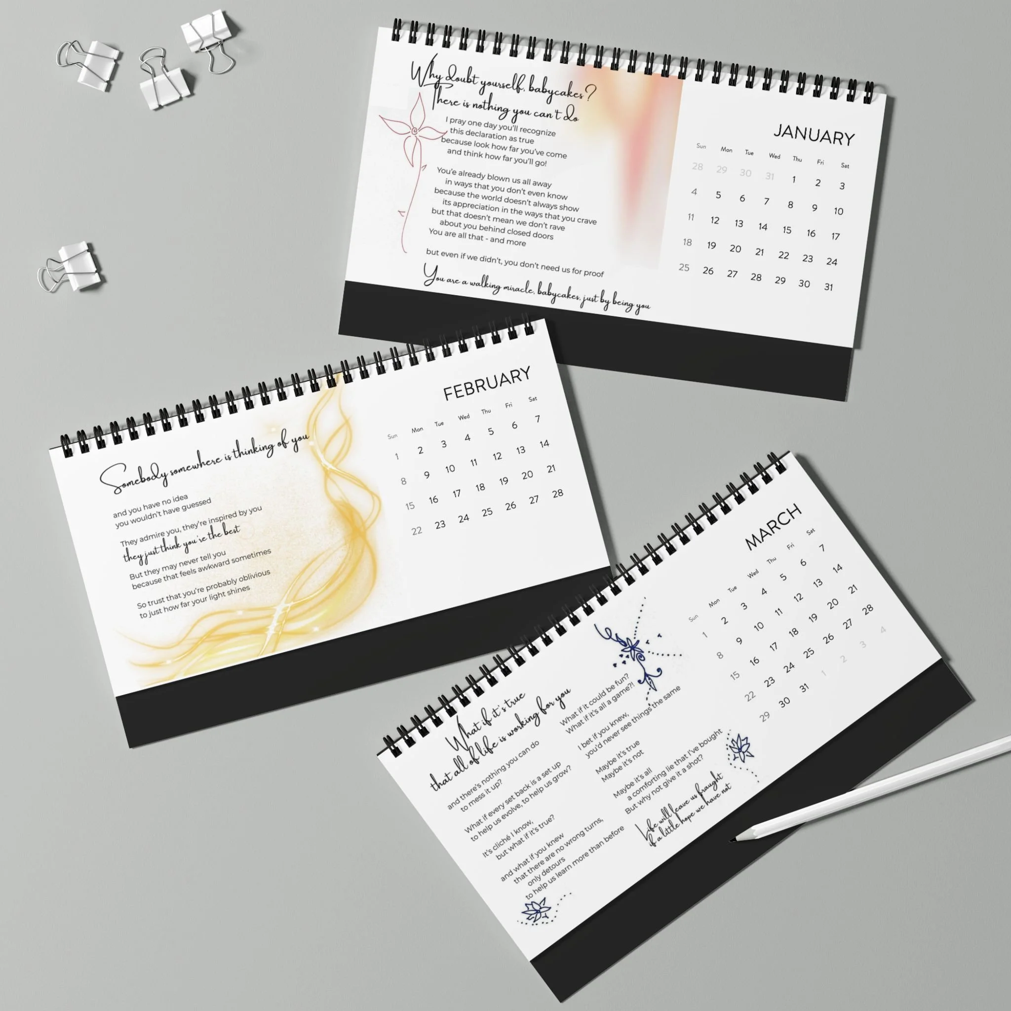 Enjoy a fresh uplifting poem every month. Reflect on it daily as this calendar accompanies you at your desk.