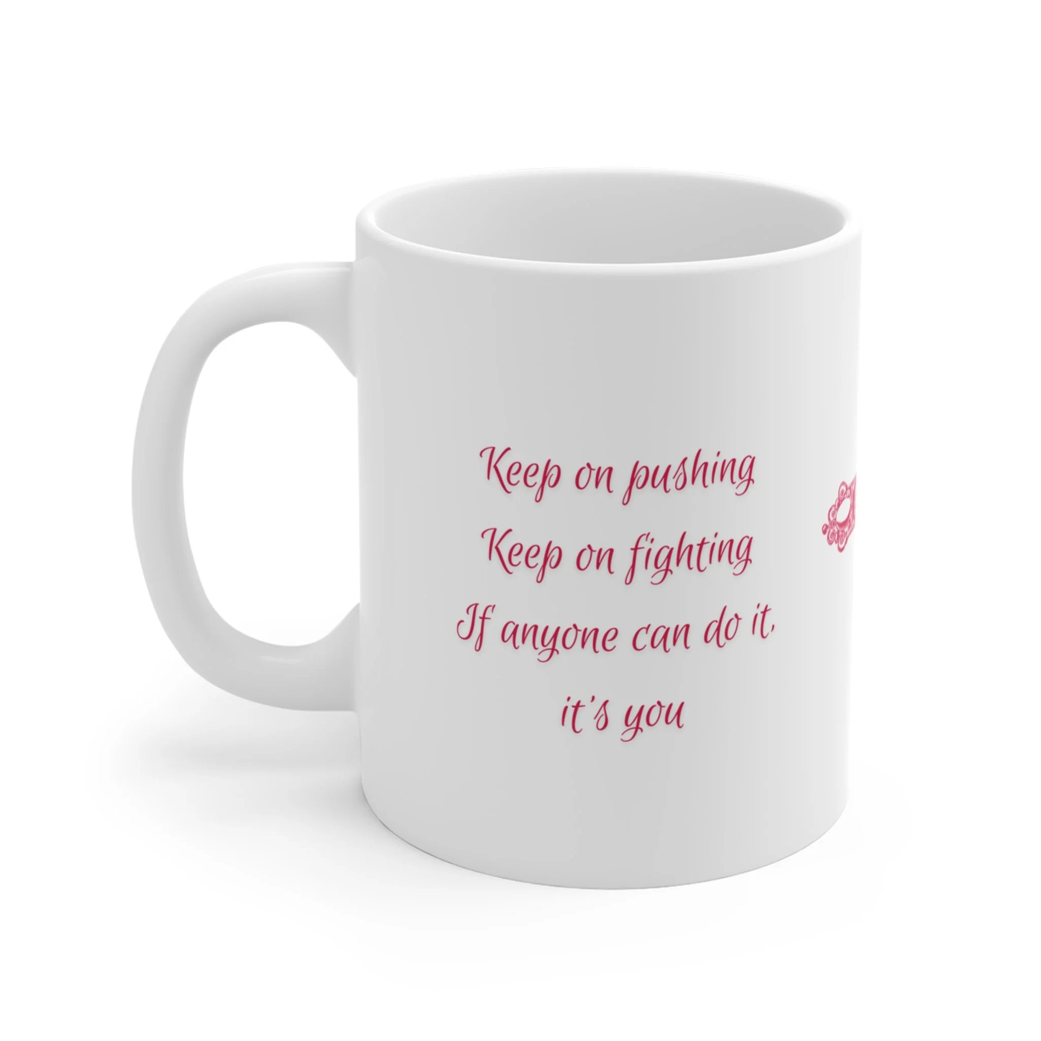 Inspirational Pink Cross Mug — "Keep on pushing, Keep on fighting" Motivational Faith Coffee Cup (11 oz)